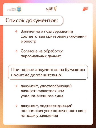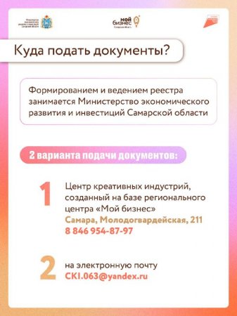 С подробной информацией: критериями включения в реестр, списком необходимых документов можно ознакомиться на едином портале господдержки mybiz63.ru в разделе «Реестр креативных индустрий Самарской области».