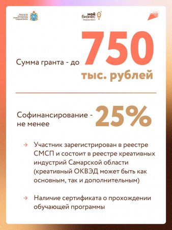Минэкономразвития Самарской области и региональный центр «Мой бизнес» вновь запускают обучающую программу для предпринимателей, создающих креативный продукт. Участие в акселераторе — первый шаг к гранту размером до 750 тысяч рублей на развитие своего творческого проекта.