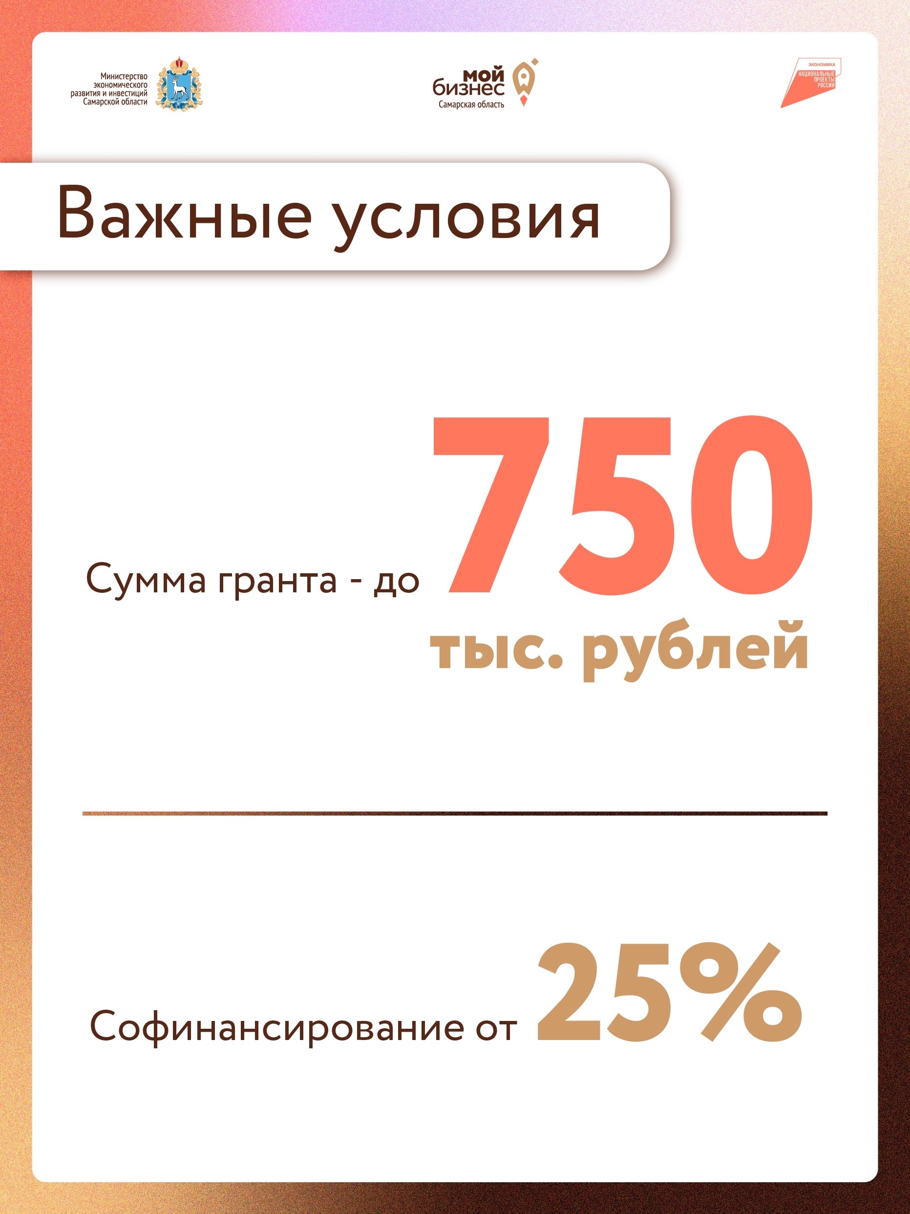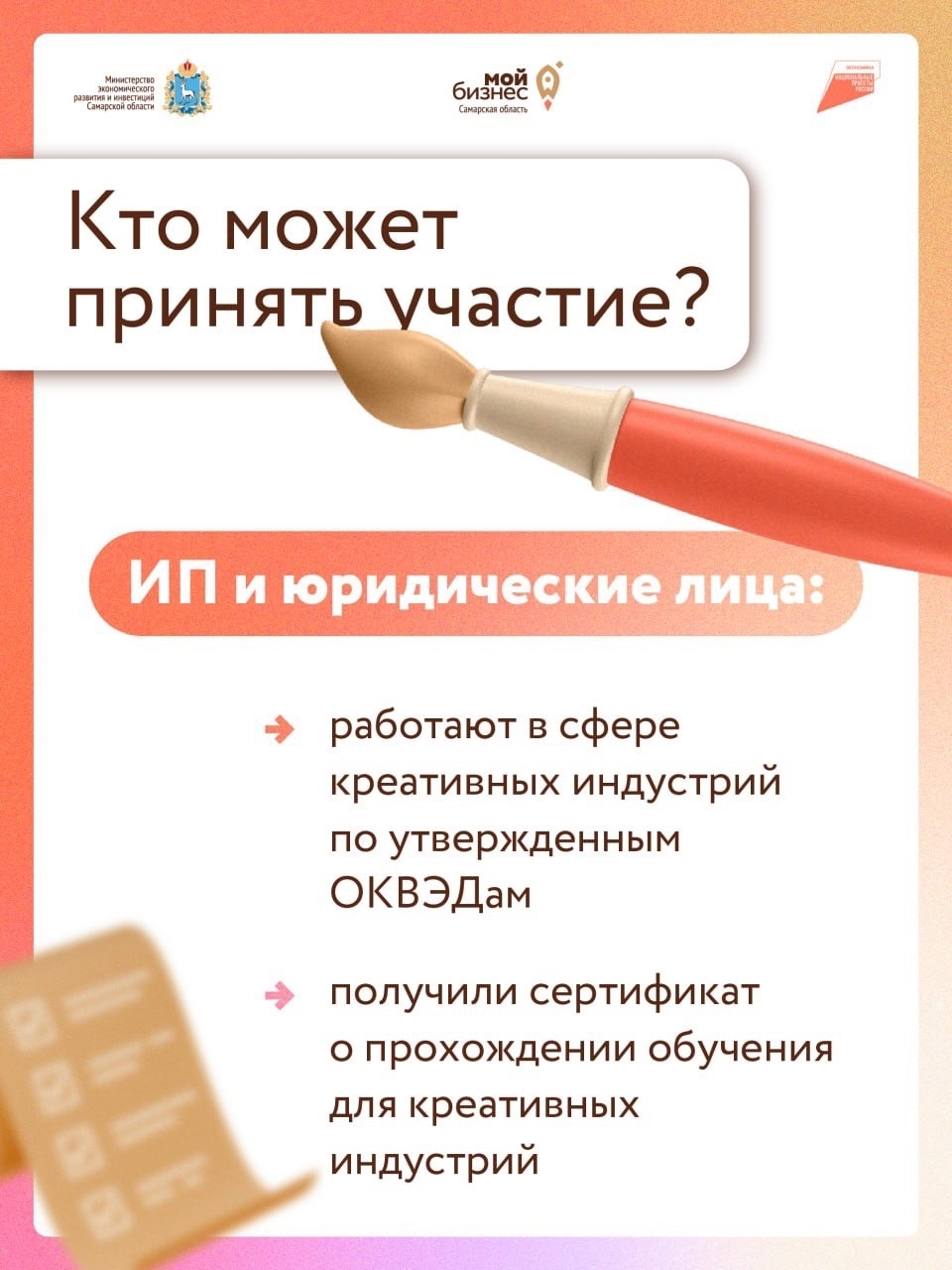 В конкурсном отборе могут принять участие ИП и юридические лица, которые получили сертификат о прохождении обучения для креативных индустрий. Одним из условий конкурса является софинансирование проектов: 75% — средства гранта, 25% — средства предпринимателя.