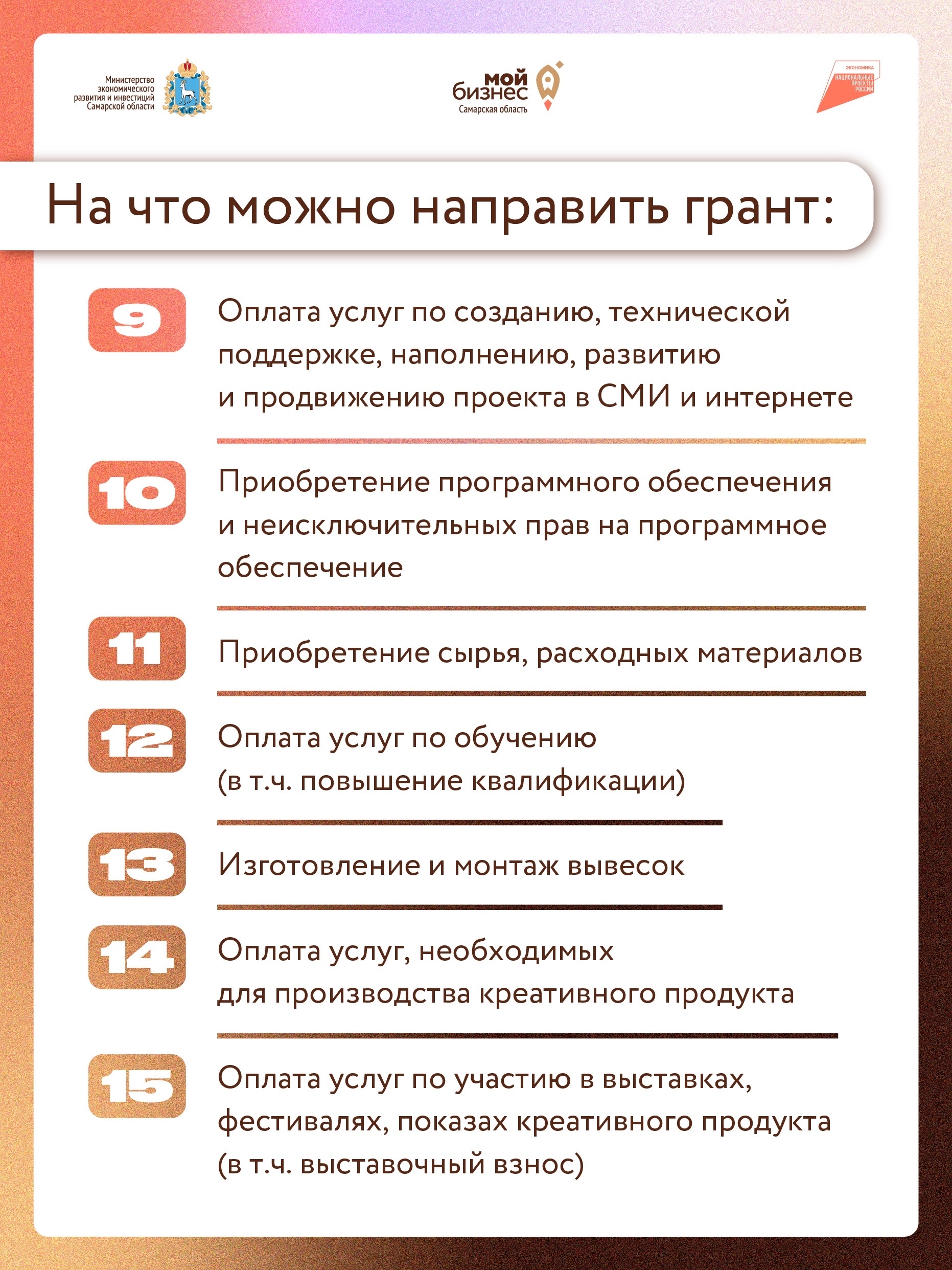 В центрах «Мой бизнес» Самарской области и на портале mybiz63.ru предприниматели из сферы креативных индустрий могут воспользоваться различными инструментами господдержки: содействие в продвижении продукции, участие в тематических региональных и федеральных выставках, информационно-консультационная поддержка. Меры поддержки реализуются по нацпроекту «Эффективная и конкурентная экономика».