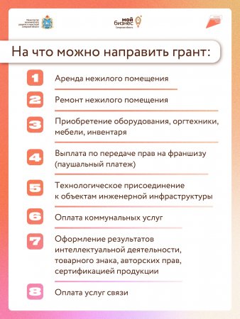 Безвозмездную субсидию можно будет направить на аренду и ремонт помещения, приобретение оборудования, сырья, сертификацию продукции, оформление товарного знака, изготовление и монтаж вывесок, паушальный платеж, оплату услуг по обучению, участию в выставках и на другие направления.