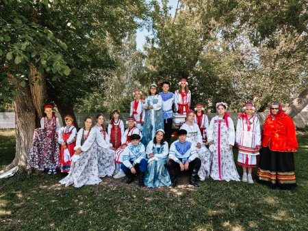 В уютном зале детского сада на импровизированной сцене юные артисты исполнили русские народные песни - "Самовар", "Завалинка", "Летели две птички", "Ах, вы сени, мои сени", а также мордовские.