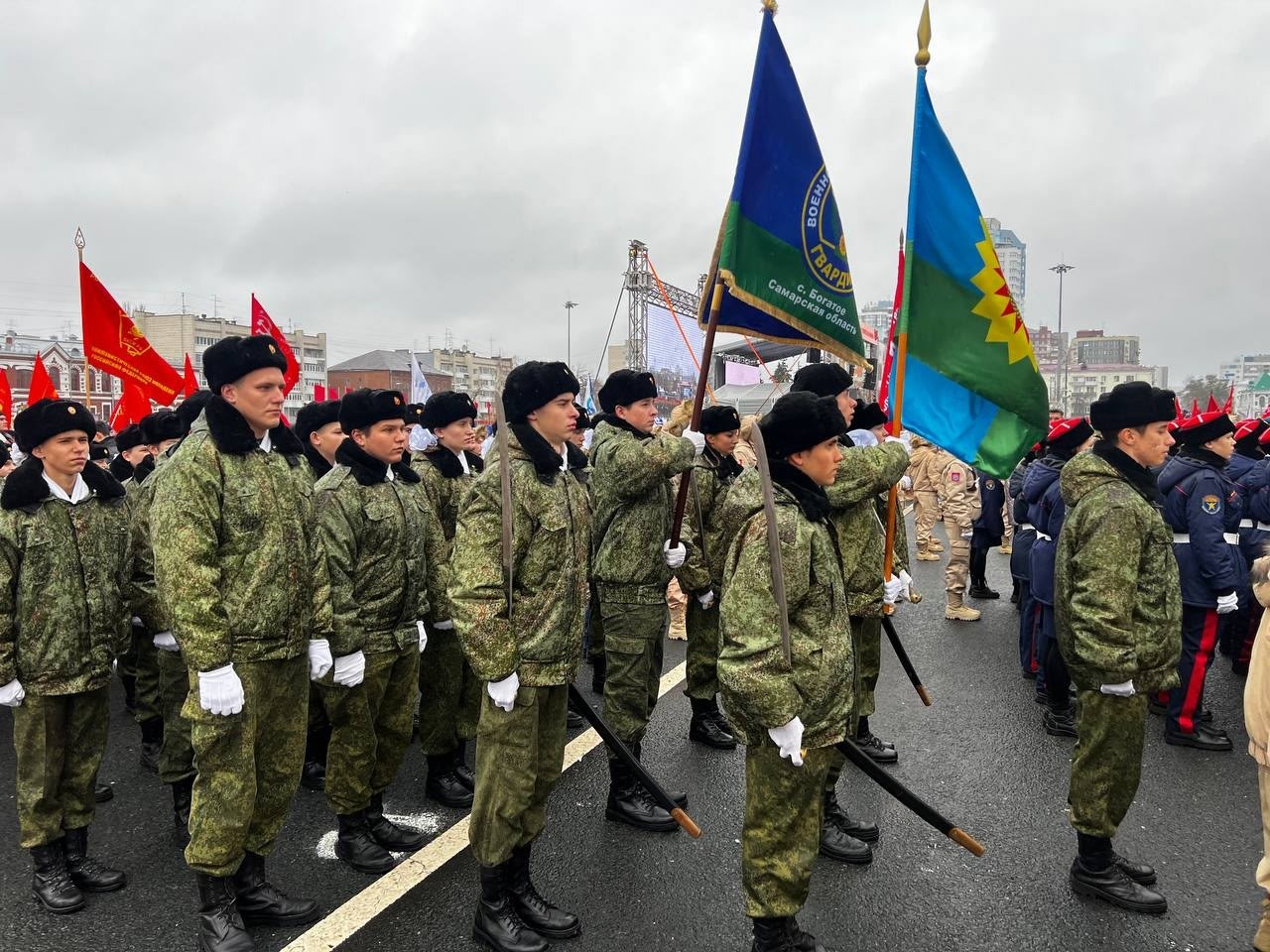 Наш парадный расчет с честью и гордостью пронес по главной площади Самарской области флаг Богатовского района и флаг ВПК "Гвардия".