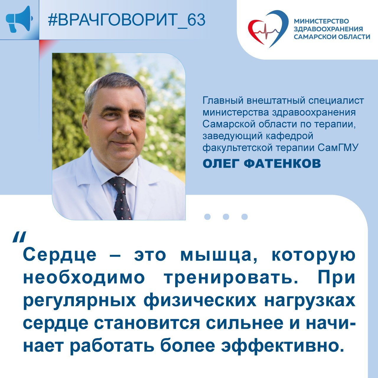 Врач-терапевт: "Регулярные занятия спортом помогают укрепить сердечную мышцу, нормализовать кровяное давление и повысить уровень полезного холестерина"Главный внештатный специалист министерства здравоохранения Самарской области по терапии, заведующий кафедрой факультетской терапии СамГМУ Олег Фатенков: